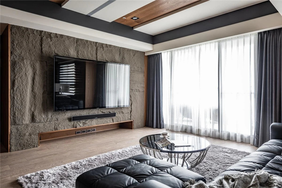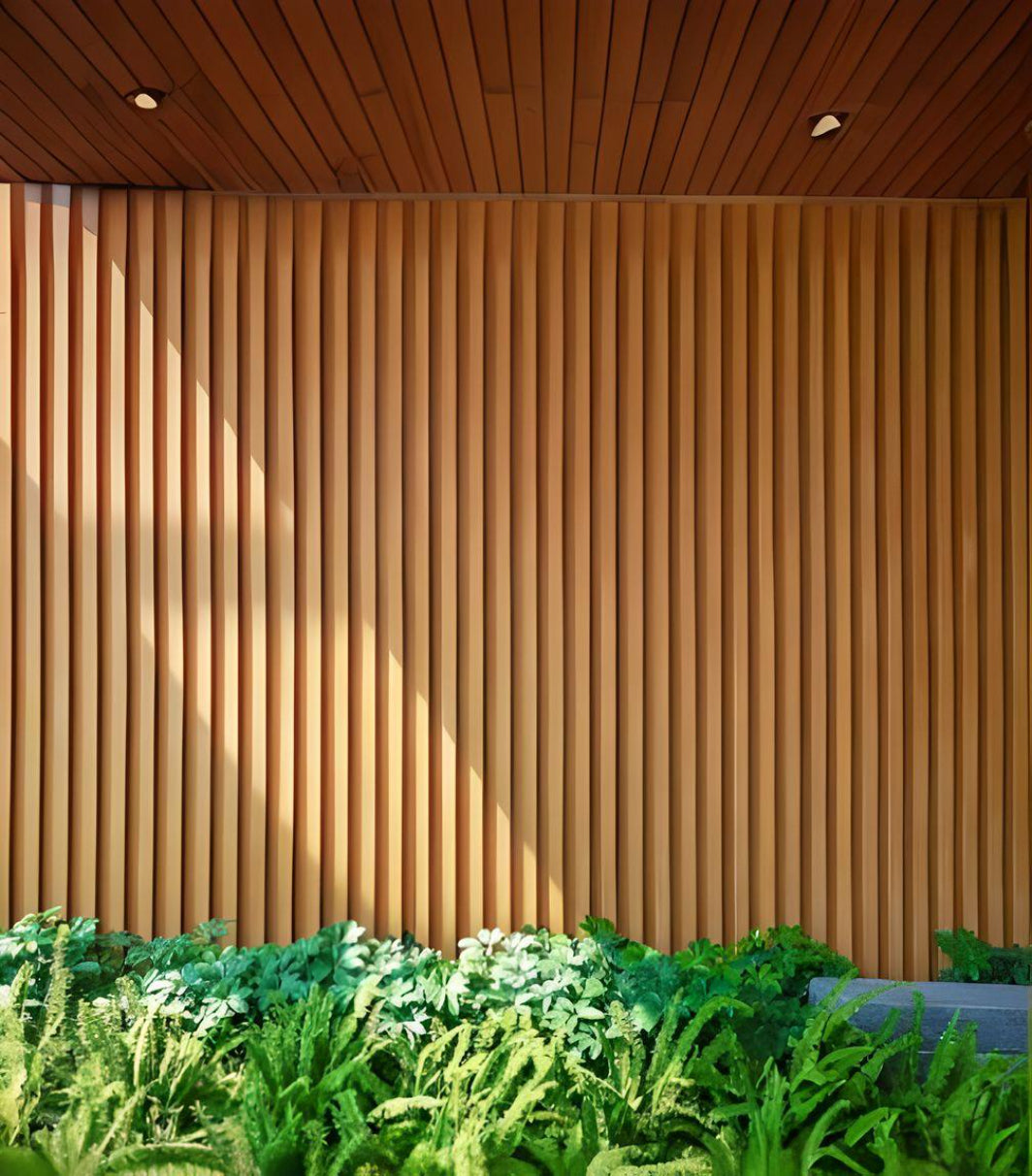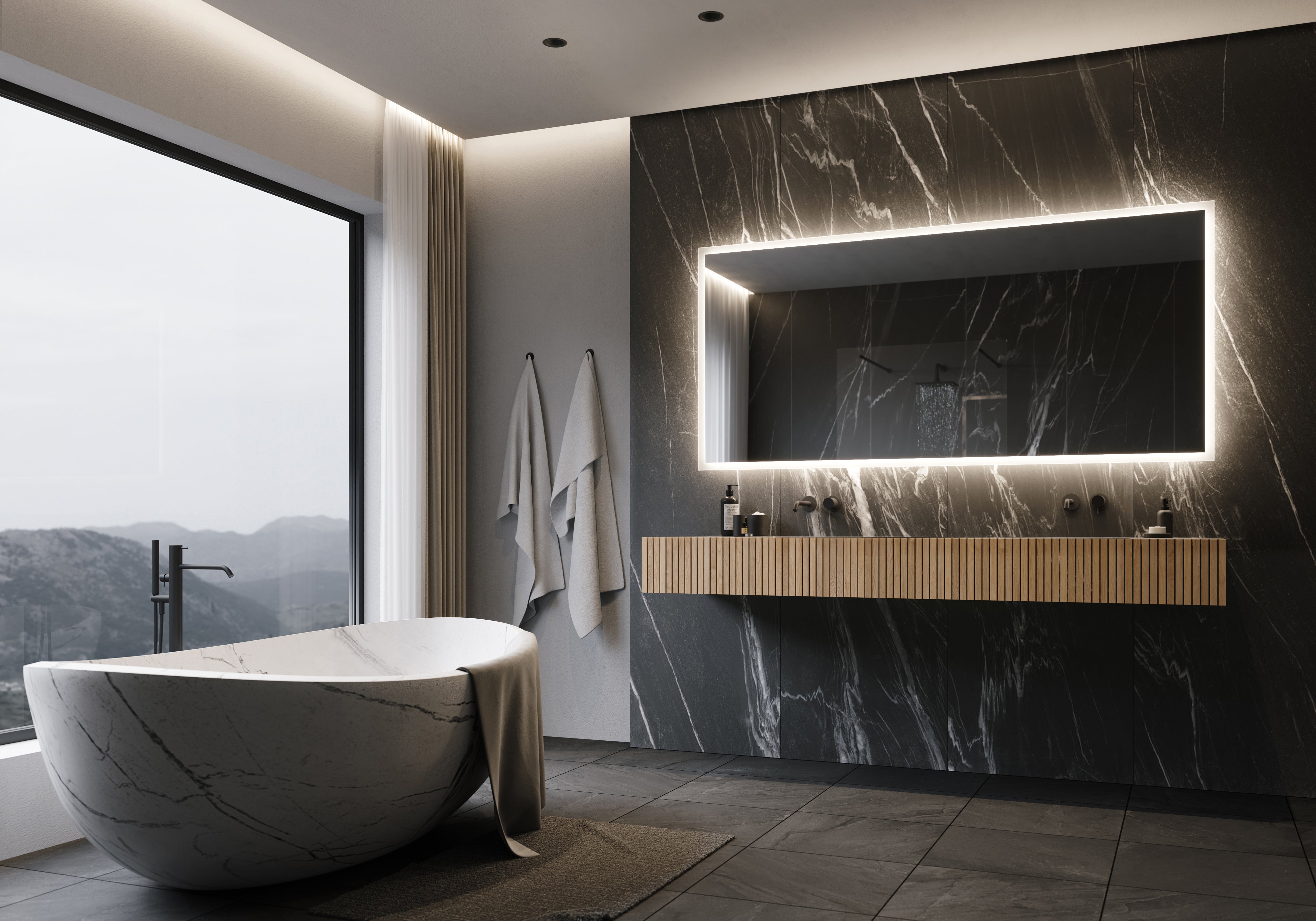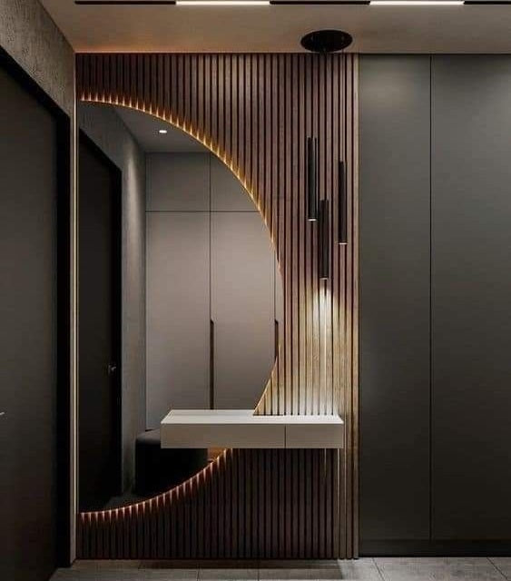 В комбинация с мрамора, дървените панели са в перфектна хармония.
